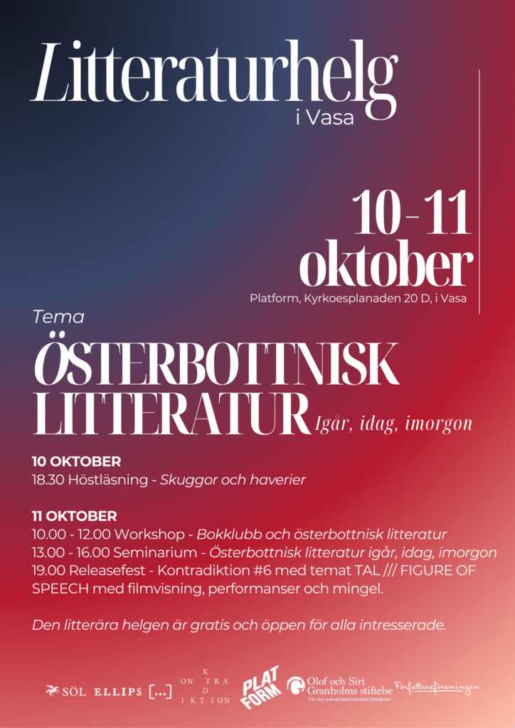 För tredje året i rad ordnas evenemanget Litteraturhelg som denna gång bjuder på fyra olika program. Årets tema är Österbottnisk litteratur – igår, idag, imorgon. Platsen är konstnärs-initiativet Platforms lokal på Kyrkoesplanaden 20 D i Vasa.