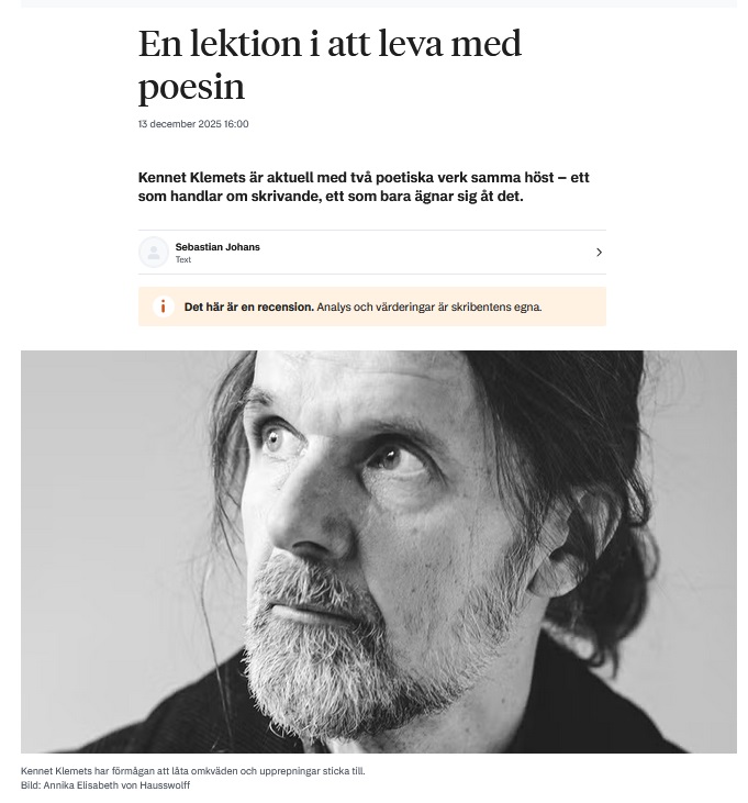 ”Det vore möjligen en överdrift att påstå att Klemets två små böcker har kraften att förlösa ett författarskap. Men den stillsamma växelverkan mellan häftena visar i varje fall hur bitterljuvt skrivandet kan vara om man bara har sittfläsk och är stryktålig nog. Är du på jakt efter en lämplig julklapp åt en spirande lyriker är ditt letande i alla händelser över. Rimma helst inte på paketet.” Sebastian Johans i Hufvudstadsbladet 13.12.2025 om Kennets Klemets diktböcker Blå, blå himmel (Ellerströms) och Minuter (Ellips, lilla e nr 16). https://www.hbl.fi/2025…/en-lektion-i-att-leva-med-poesin/