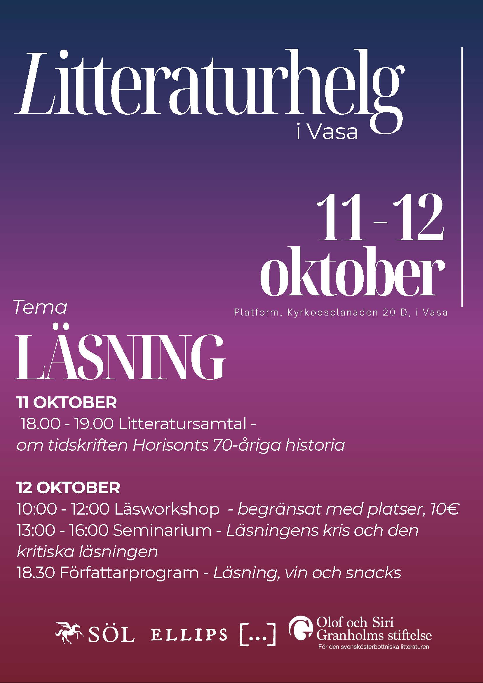 Vi ger ut litteratur på svenska i Finland. Våra intresseområden är poesi, kortprosa, genretänjande former och essäistiska texter.